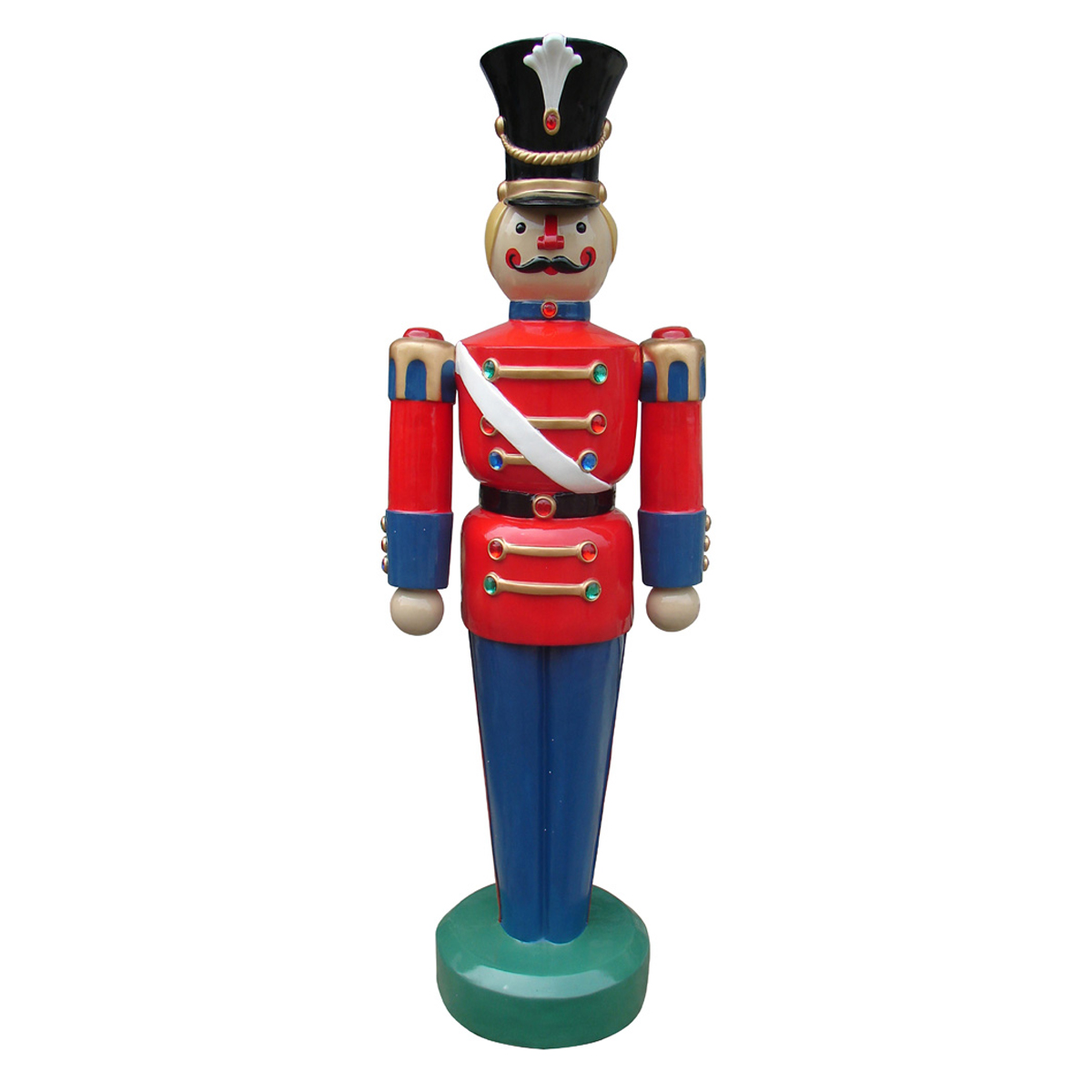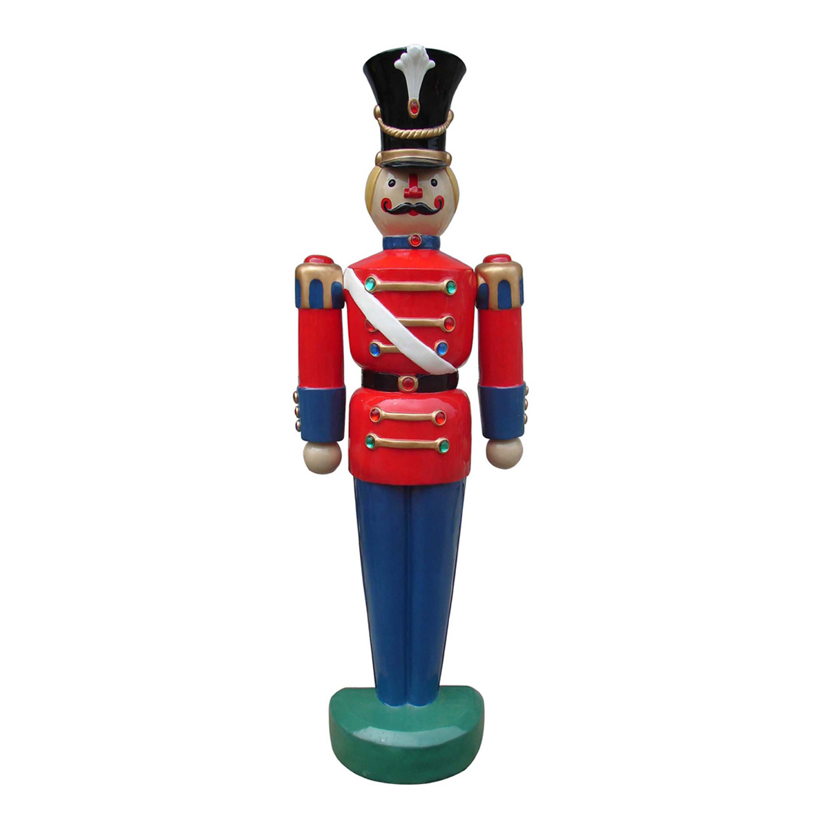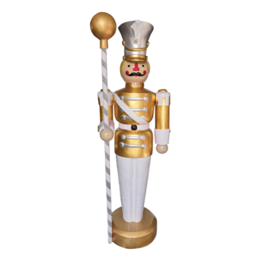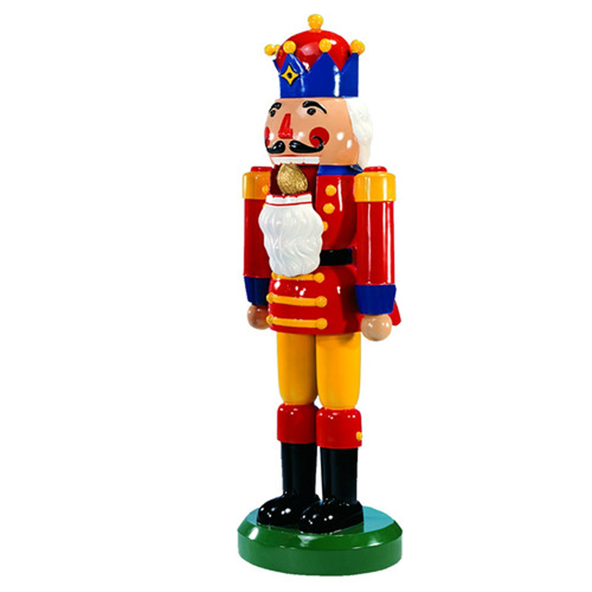 An excellent addition to a Christmas display, this brilliantly colored Nutcracker adds a fun, cheerful element to any decor. Well-suited for shopping malls, big box stores, window displays, hotel lobbies, event centers, city parks, courtyards, thoroughfares, churches, commercial Christmas displays, and residential displays. Dimensions are 75 inch tall and 61lbs in weight. Fiberglass construction, ideal for indoor and outdoor use. Automotive-grade paint job.
