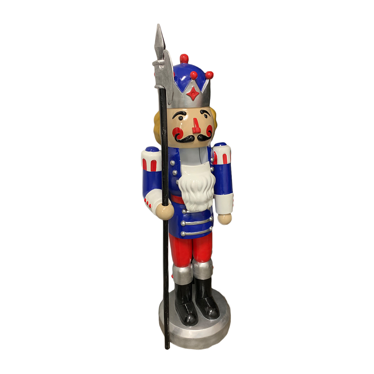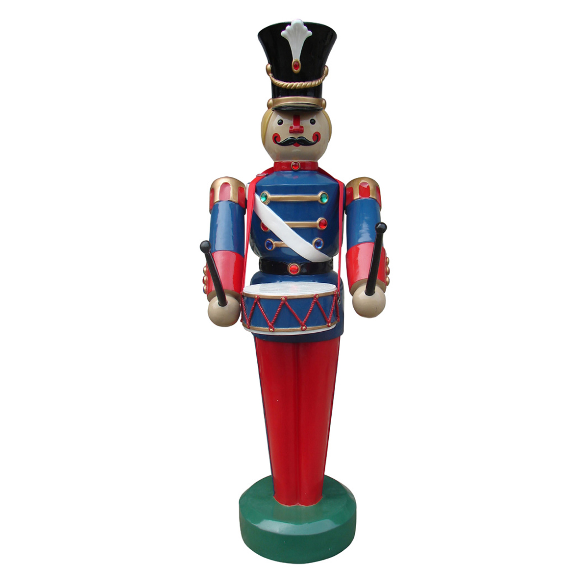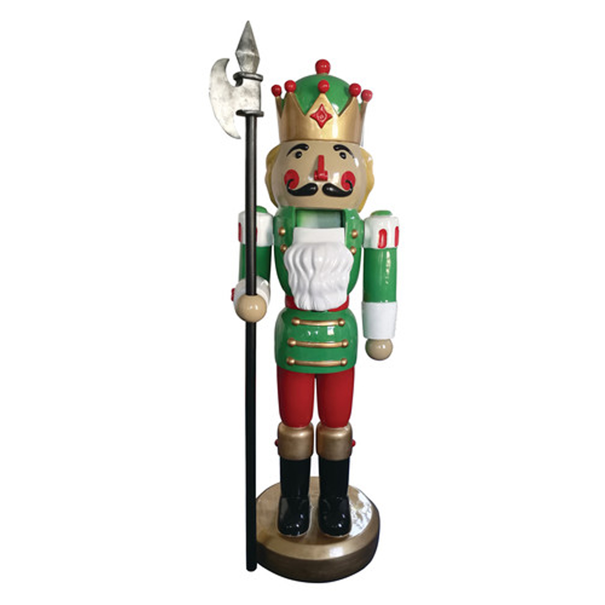 An excellent addition to a Christmas display, this brilliantly colored Nutcracker adds a fun, cheerful element to any decor. Well-suited for shopping malls, big box stores, window displays, hotel lobbies, event centers, city parks, courtyards, thoroughfares, churches, commercial Christmas displays, and residential displays. Dimensions are 75 inch tall and 61lbs in weight. Fiberglass construction, ideal for indoor and outdoor use. Automotive-grade paint job.