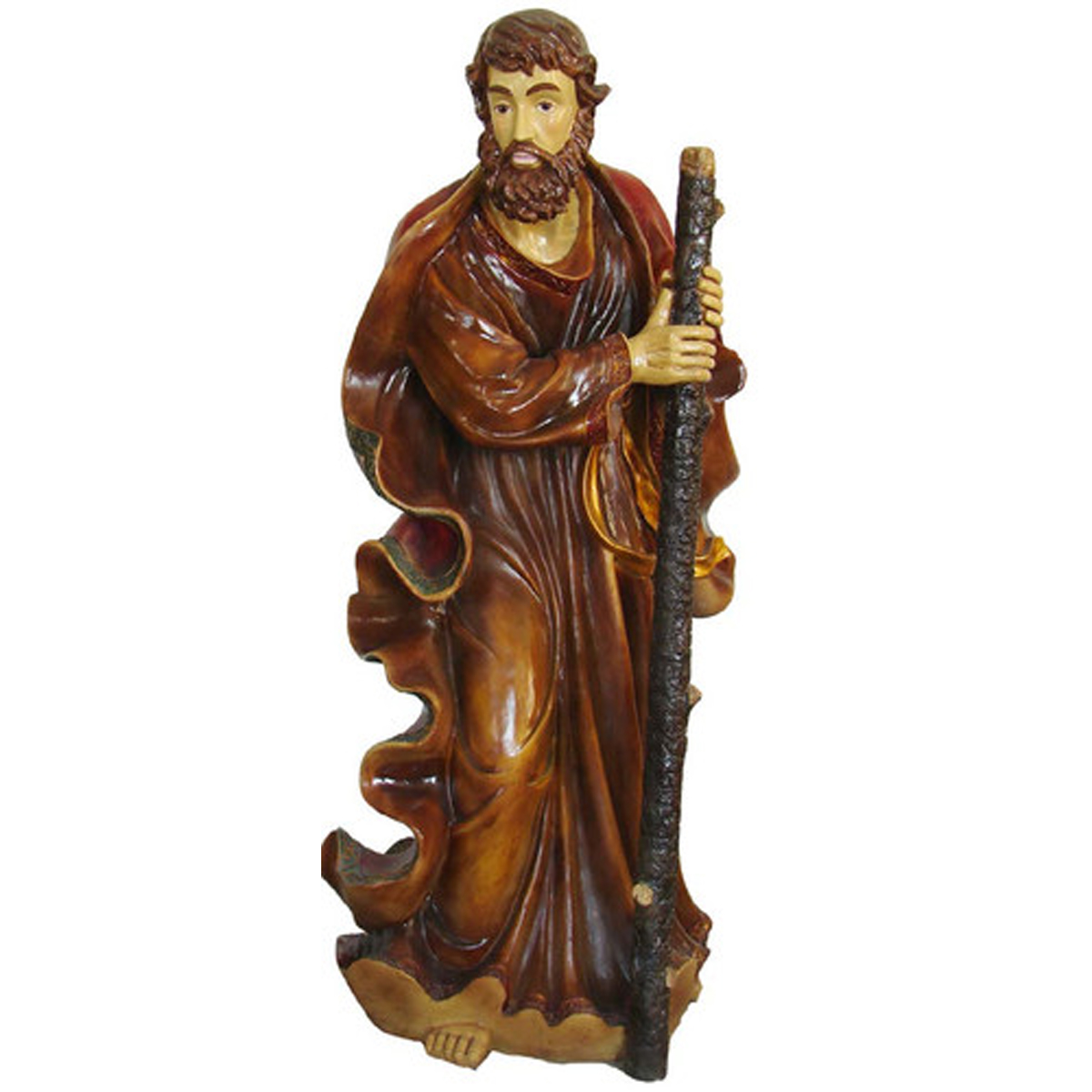 The perfect addition to a Nativity scene, this life-size Joseph is 72" x 33.75" x 28 inch and weighs 43 lbs. Made of fiberglass and painted. Well-suited for shopping malls, big box stores, window displays, hotel lobbies, event centers, city parks, courtyards, thoroughfares, churches, commercial Christmas displays, and residential displays.