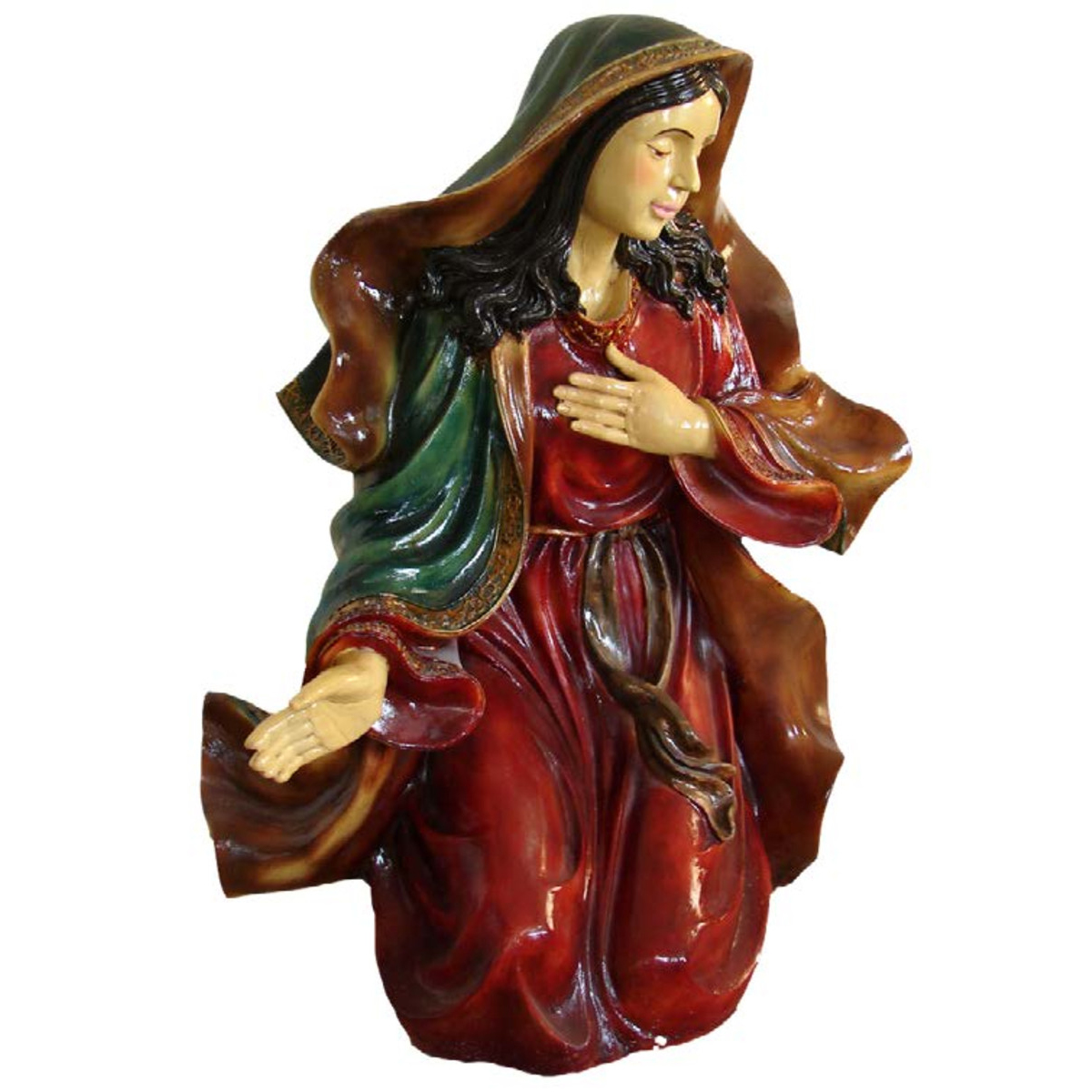 The perfect addition to a Nativity scene, this life-size Mary is made of fiberglass and painted. Well-suited for shopping malls, big box stores, window displays, hotel lobbies, event centers, city parks, courtyards, thoroughfares, churches, commercial Christmas displays, and residential displays. Dimension are 42" x 35.5" x 27 inch. Weight is 82 lbs.