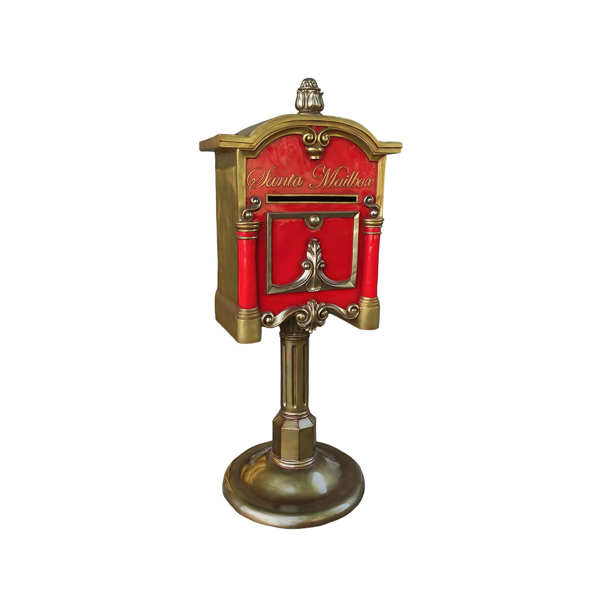 The perfect complement to a Christmas display, Santa's mailbox is gold and red in color and measures 5.6 x 2.1 x 2.3. Weight is 60.4 lbs. Well-suited for shopping malls, big box stores, window displays, hotel lobbies, event centers, city parks, courtyards, thoroughfares, churches, commercial Christmas displays, and residential displays.