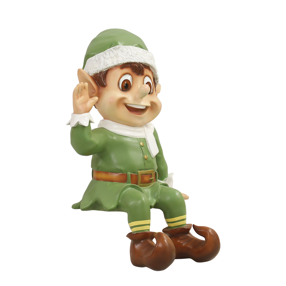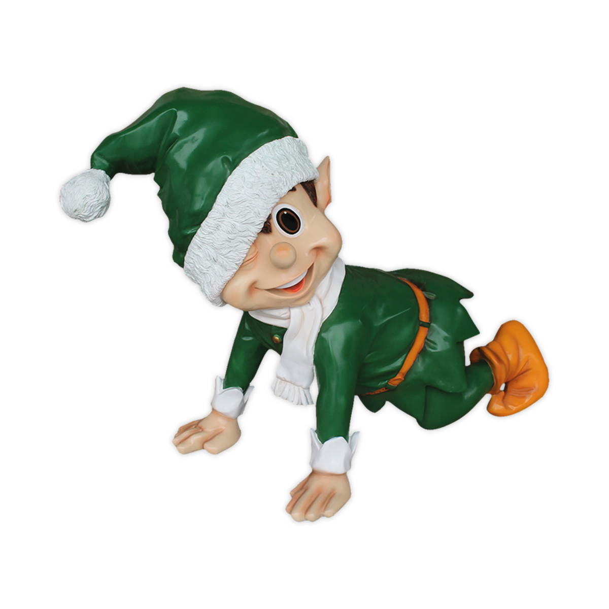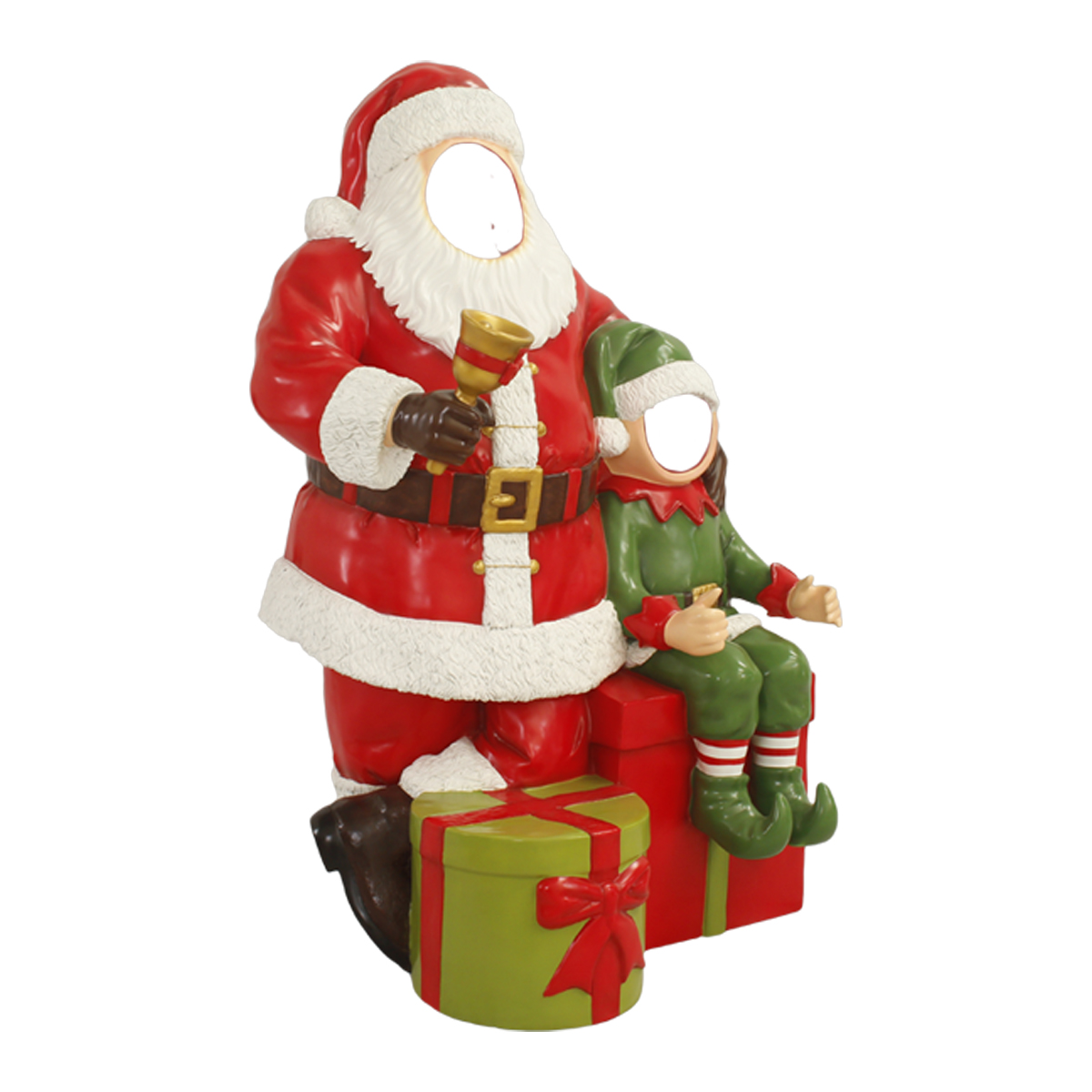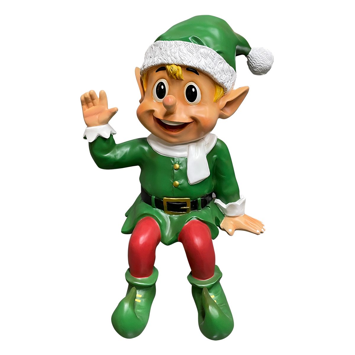 What better Christmas photo-op than to have your picture taken with a life-size Christmas elf? Perfect for shopping malls, big box stores, window displays, hotel lobbies, event centers, city parks, courtyards, thoroughfares, churches, commercial Christmas displays, and residential displays, this Christmas elf photo-op has the following dimension specs: 63 x 41 x 34. Made of fiberglass and painted.