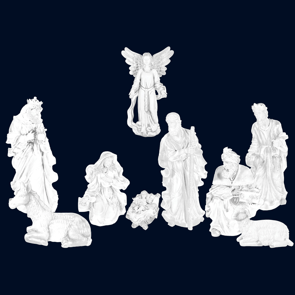 This life-size Nativity scene includes an Angel, Baby Jesus, Donkey, Lamb, Joseph, King Balthazar, King Gaspar, King Melchoir, and Mary. Perfect for shopping malls, big box stores, window displays, hotel lobbies, event centers, city parks, courtyards, thoroughfares, churches, commercial Christmas displays, and residential displays.