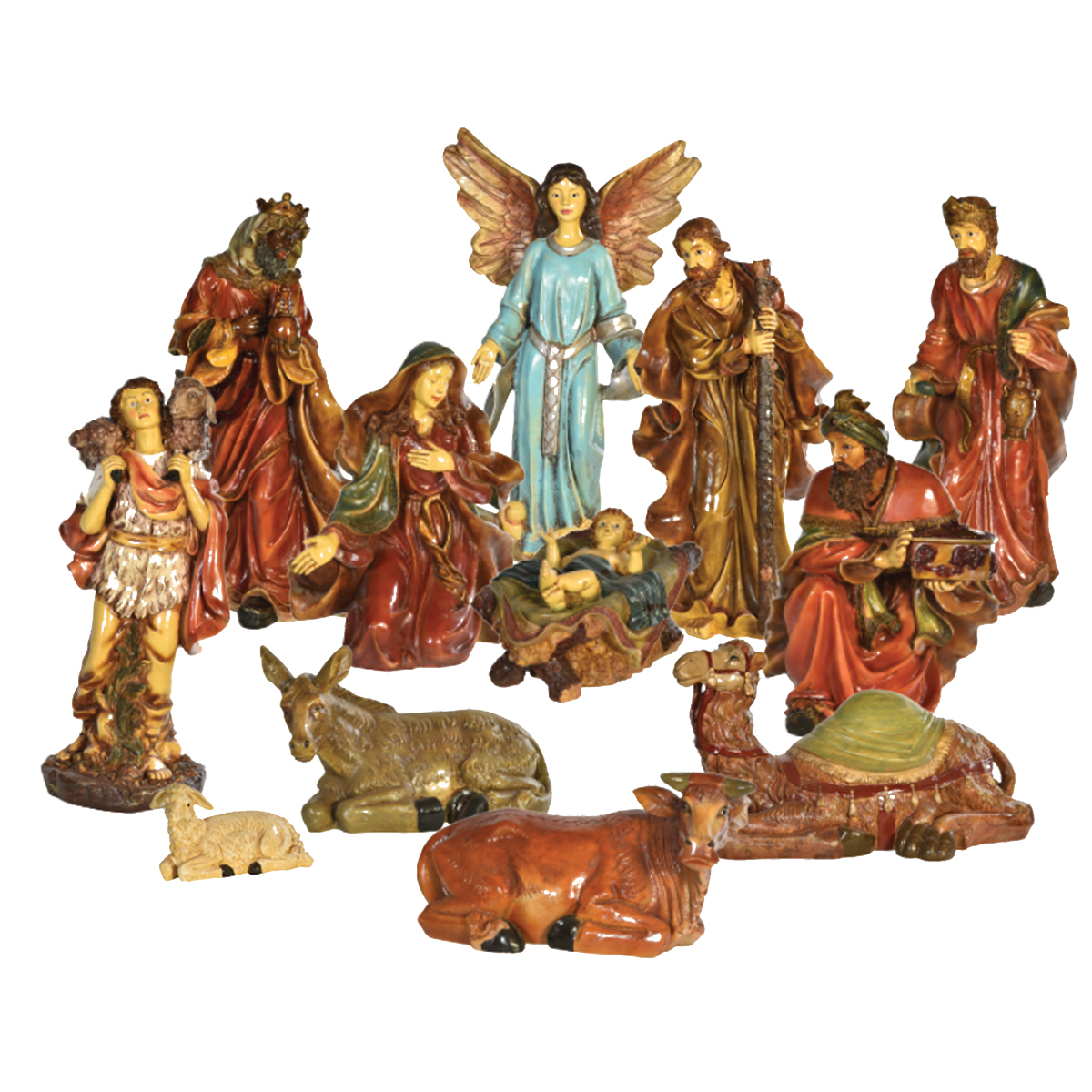 This Nativity scene includes a Small Angel, Small Baby Jesus, Small Camel, Small Donkey, Small Gabriel w/Lamb, Small Joseph, Small King Balthazar, Small King Gaspar, Small King Melchoir, Small Lamb, Small Mary, and Small Ox. Perfect for shopping malls, big box stores, window displays, hotel lobbies, event centers, city parks, courtyards, thoroughfares, churches, commercial Christmas displays, and residential displays.