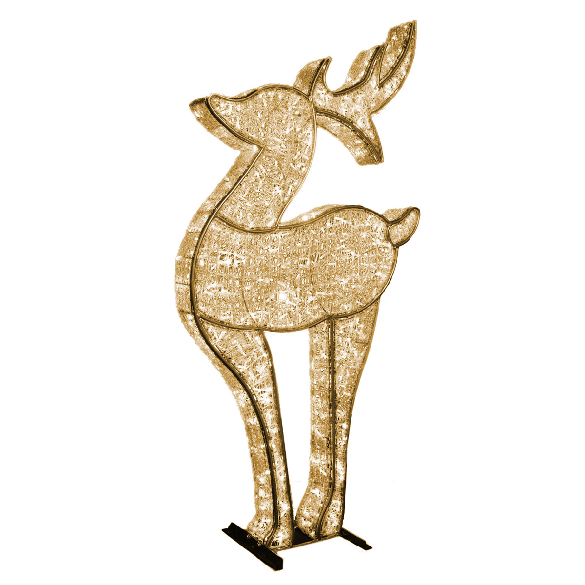 Gold and brilliantly lit thanks to 640 LED bulbs, this Christmas display is 7ft tall, woven with transparent PVC mesh. This Christmas reindeer display is made from sturdy, lightweight aluminum. Power supply is included.