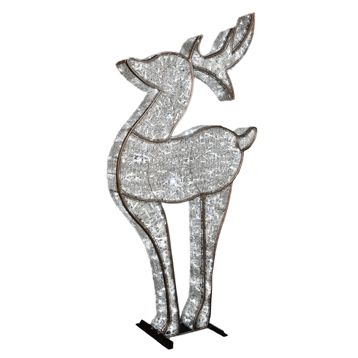 Silver in color, 9ft tall, woven with transparent PVC mesh and 1,840 LED bulbs, this Christmas reindeer display is made from sturdy, lightweight aluminum. Power supply is included.