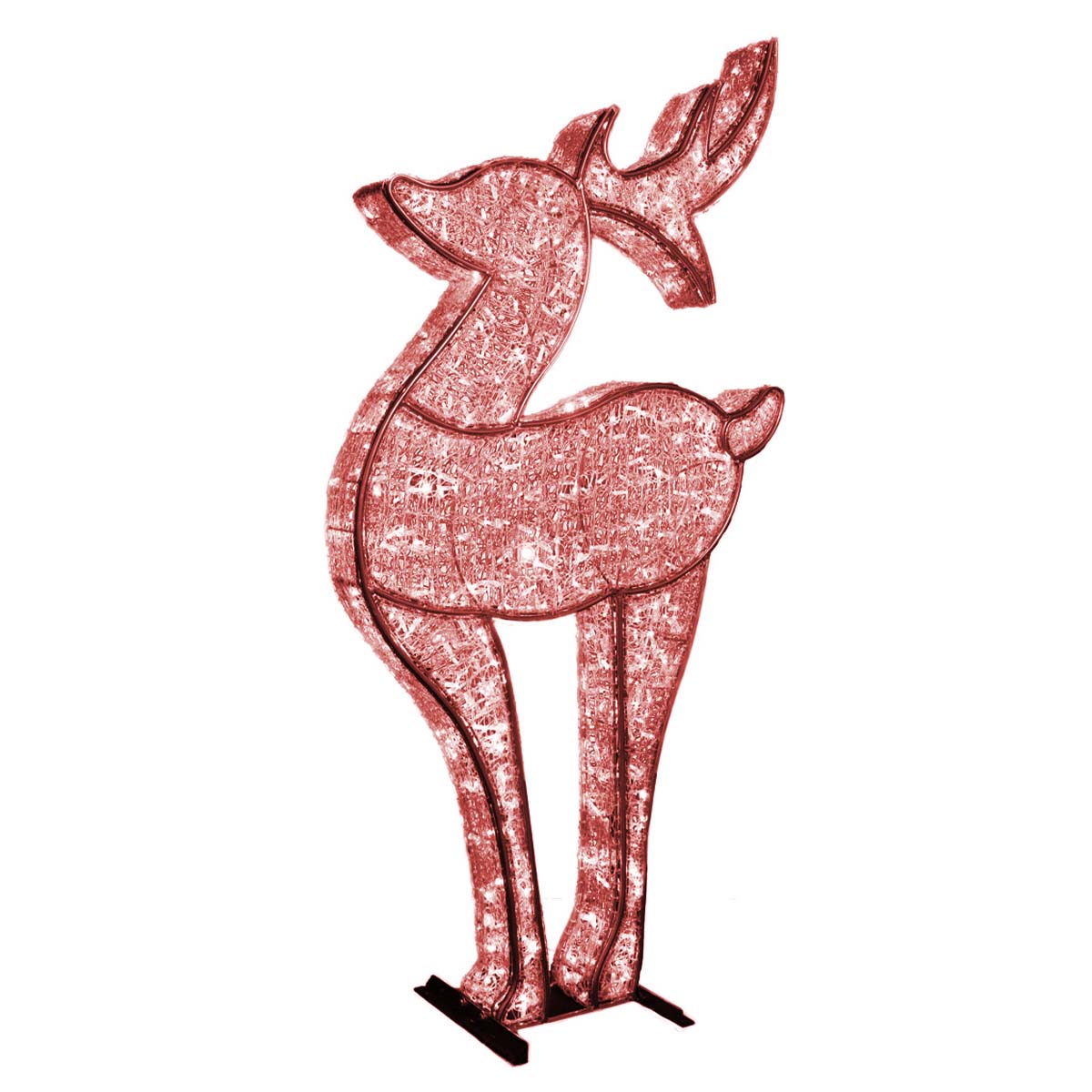 7ft tall, woven with transparent PVC mesh and hundreds of LED bulbs, this Christmas reindeer display is made from sturdy, lightweight aluminum. Power supply is included.