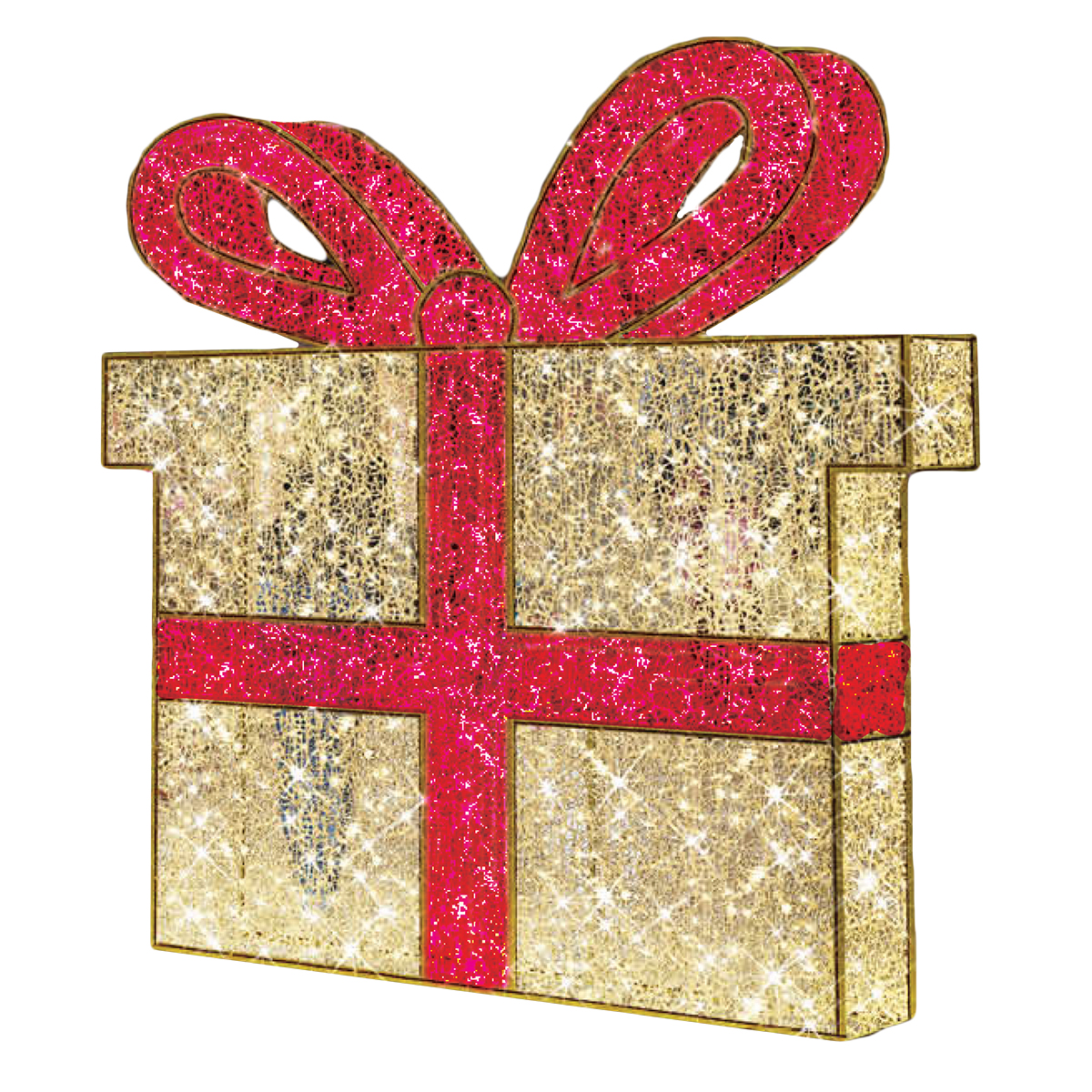Three dimensional Christmas displays bring the holidays to life, evidenced by this brilliantly illuminated 3D gift box, gold in color with a red bow. Measuring 118 inch by 103 inch, aluminum construction with 3,200 LED bulbs strung throughout the display's frame, this gorgeous decor is life-like and realistic thanks to a transparent PVC net that adds volume to the display and gives it its depth. Display comes with its own power supply, 24 volts.