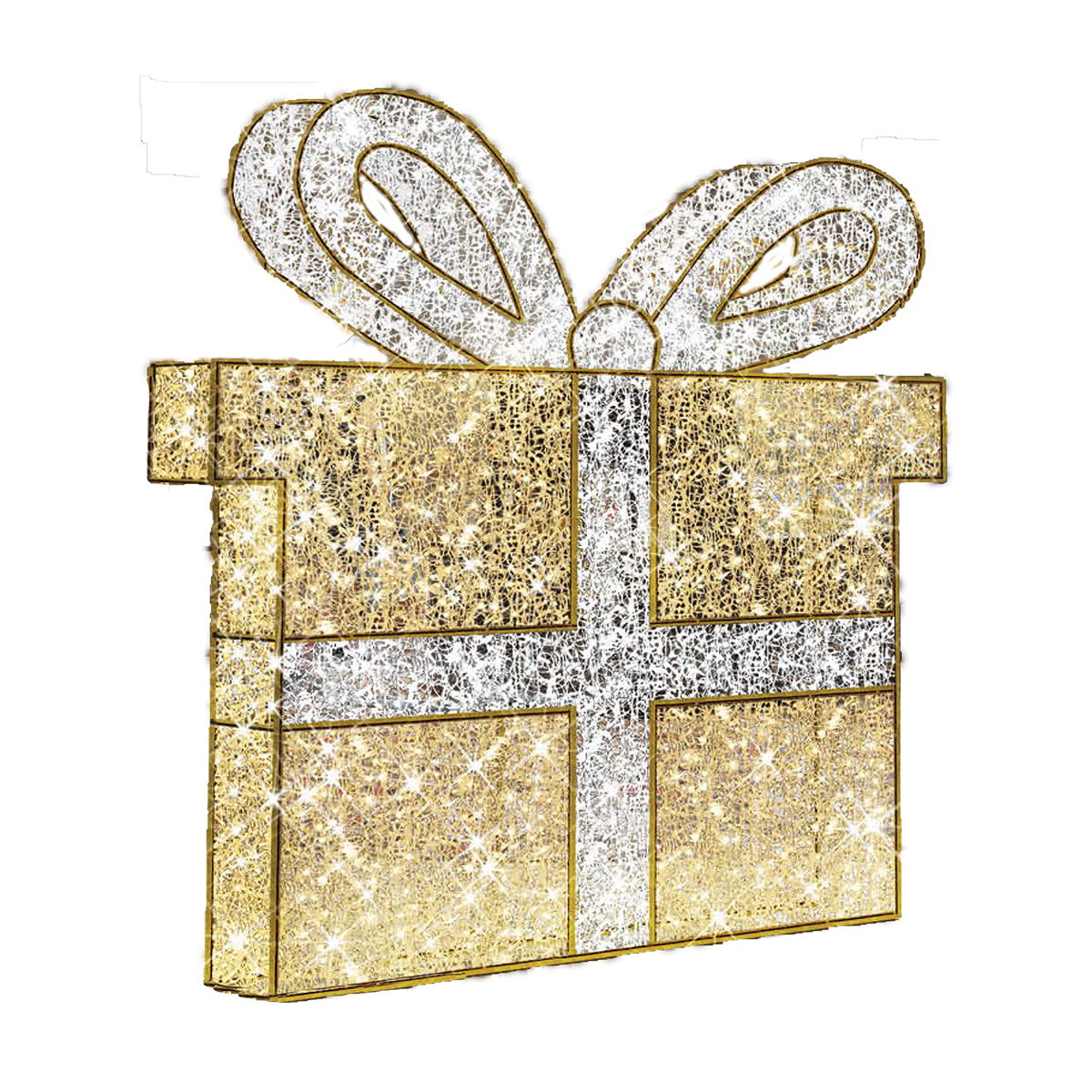 Three dimensional Christmas displays bring the holidays to life, evidenced by this brilliantly illuminated 3D gift box, gold in color with a white bow. Measuring 118 inch by 103 inch, aluminum construction with 3,200 LED bulbs strung throughout the display's frame, this gorgeous decor is life-like and realistic thanks to a transparent PVC net that adds volume to the display and gives it its depth. Display comes with its own power supply, 24 volts.