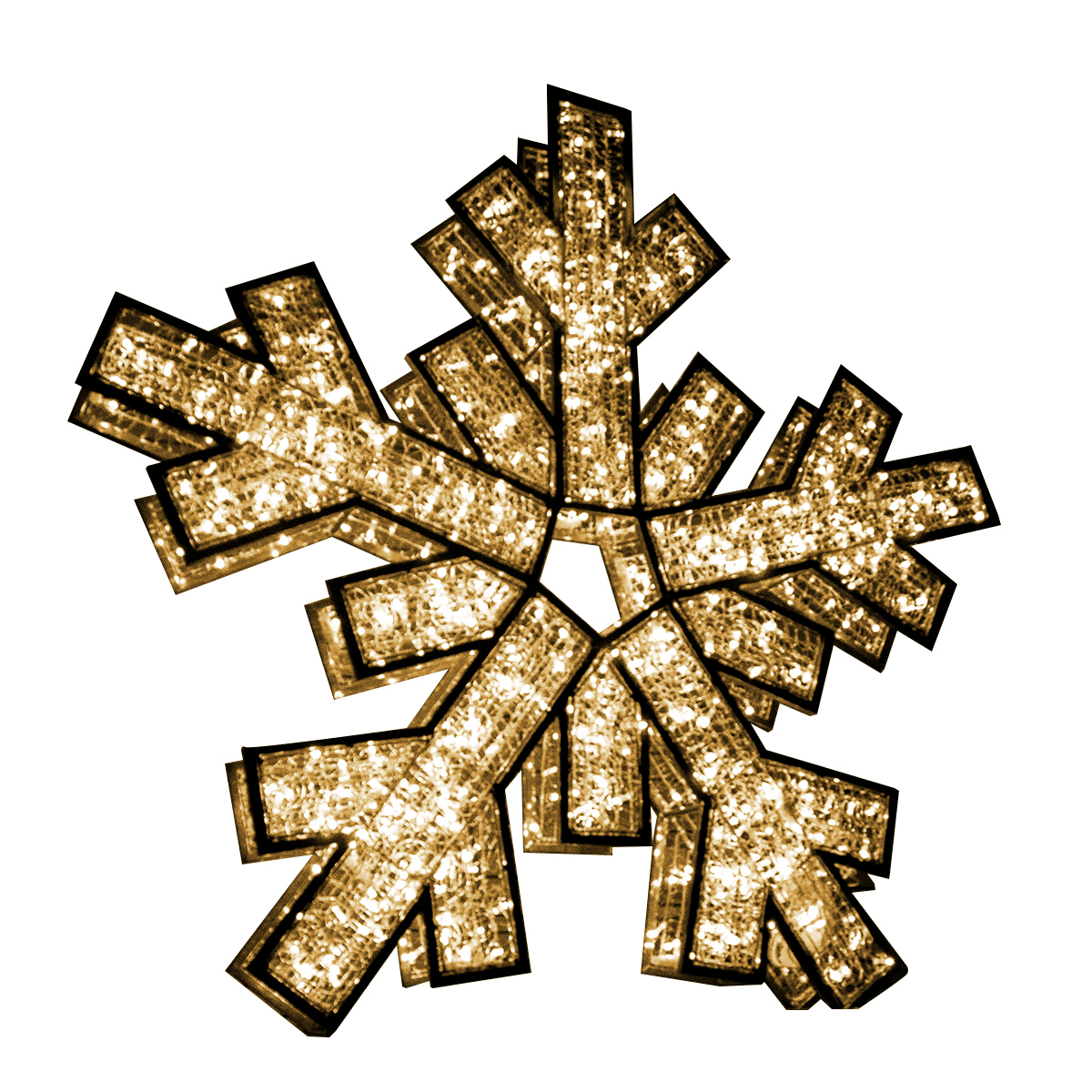 The key to creating the best Christmas display is to utilize three dimensional live forms. Such Christmas decor pieces provide the most realistic, immersive, and interactive Christmas display experience. This 118 inch by 113 inch snowflake with 1,440 gold LED bulbs is three dimensional with painted aluminum construction and transparent PVC net creating the form of the display. The stunning LED lights have 10% flash and are wound between a gold interior and around a black-metal frame. A 24 volt power supply is included.