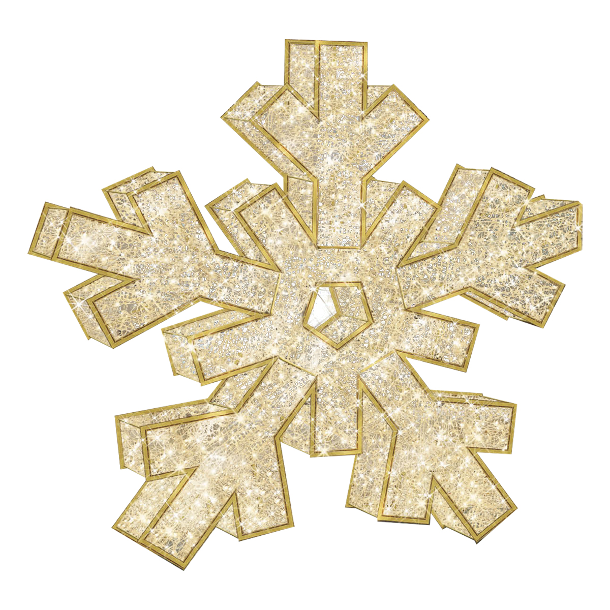 The key to creating the best Christmas display is to utilize three dimensional live forms. Such Christmas decor pieces provide the most realistic, immersive, and interactive Christmas display experience. This 118 inch by 113 inch gold-with-black-border snowflake is three dimensional with painted aluminum construction and transparent PVC net creating the form of the display. Throughout the display are hundreds of stunning LED lights with 10% flash. A 24 volt power supply is included.