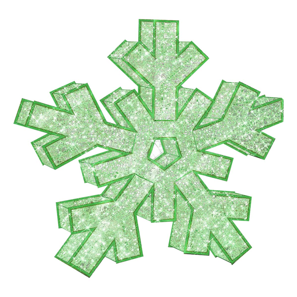 The key to creating the best Christmas display is to utilize three dimensional live forms. Such Christmas decor pieces provide the most realistic, immersive, and interactive Christmas display experience. This 118 inch by 113 inch green snowflake is three dimensional with painted aluminum construction and transparent PVC net creating the form of the display. Throughout the display are hundreds of stunning LED lights with 10% flash. A 24 volt power supply is included.