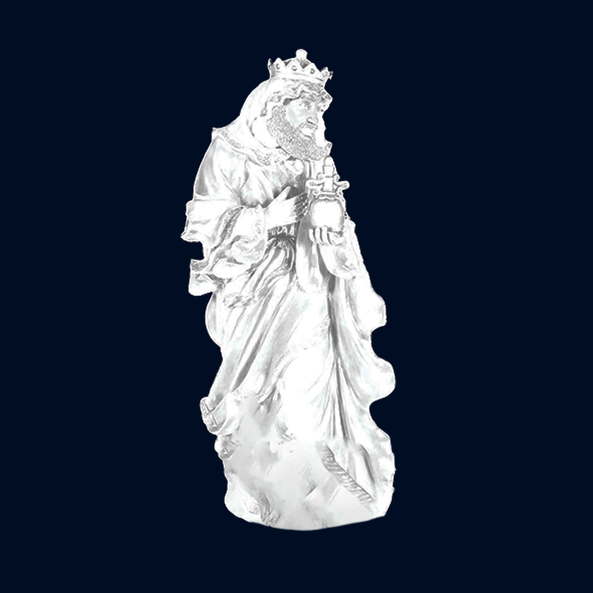 The perfect addition to a Nativity scene, this life-size King Melchior is 48" x 36" x 31 inch and weighs 92 lbs. Made of fiberglass and painted. Well-suited for shopping malls, big box stores, window displays, hotel lobbies, event centers, city parks, courtyards, thoroughfares, churches, commercial Christmas displays, and residential displays.