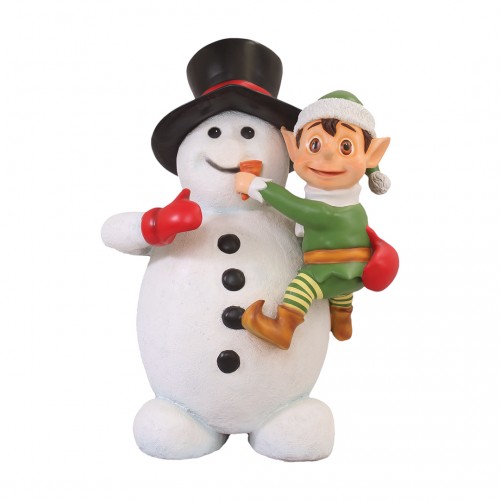 Christmas is not Christmas without a snowman display! This seasonal creation features a snowman and Santa's elf frolicking in the way that cheerful snowmen and elves do. Perfect for shopping malls, big box stores, window displays, hotel lobbies, event centers, city parks, courtyards, thoroughfares, churches, commercial Christmas displays, and residential displays. Dimensions are: L: 39.4", W: 31.5", H: 59" 71 LBS. Made of fiberglass and painted.