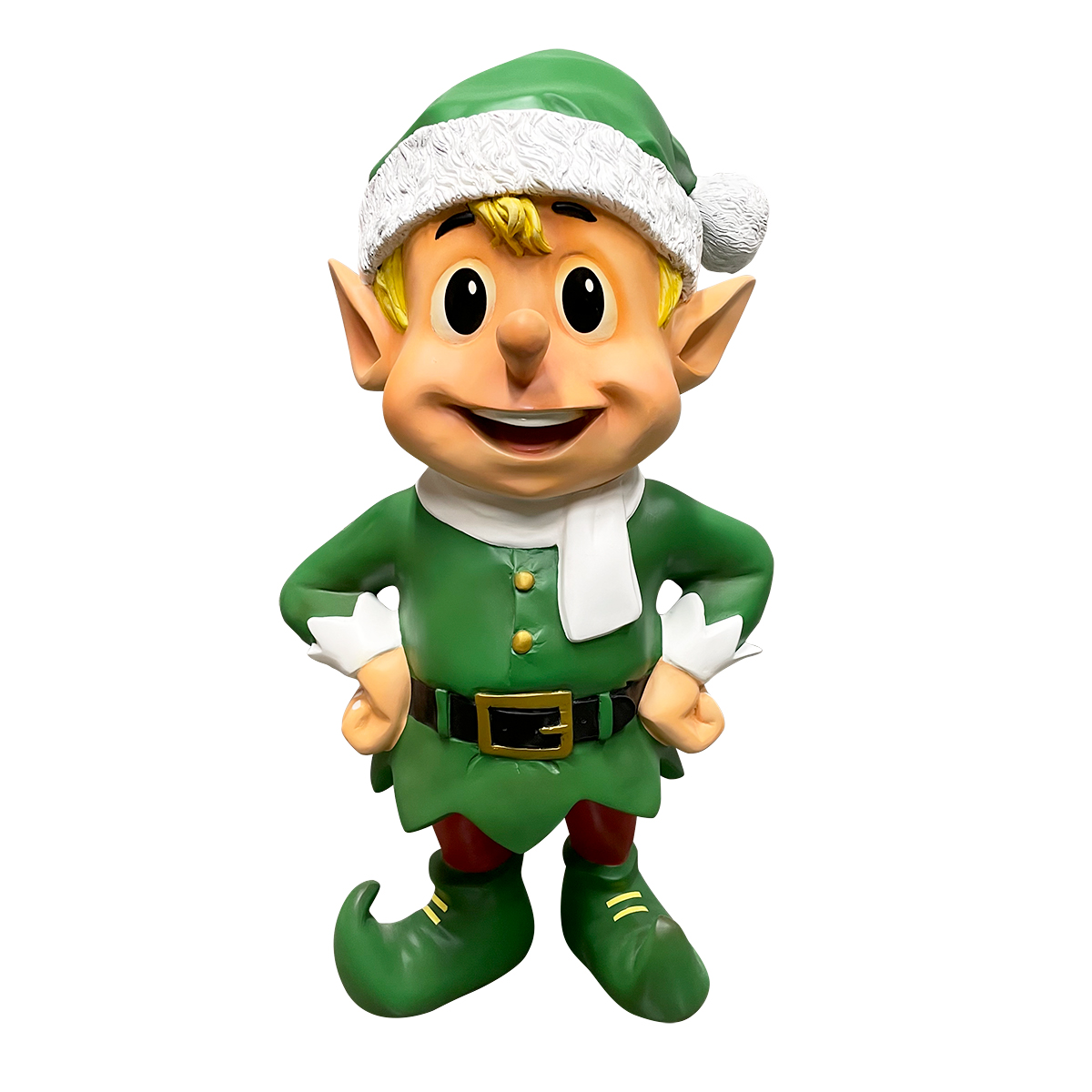 What better Christmas photo-op than to have your picture taken with a life-size Christmas elf? Perfect for shopping malls, big box stores, window displays, hotel lobbies, event centers, city parks, courtyards, thoroughfares, churches, commercial Christmas displays, and residential displays, this Christmas elf photo-op has the following dimension specs: 63 x 41 x 34. Made of fiberglass and painted.