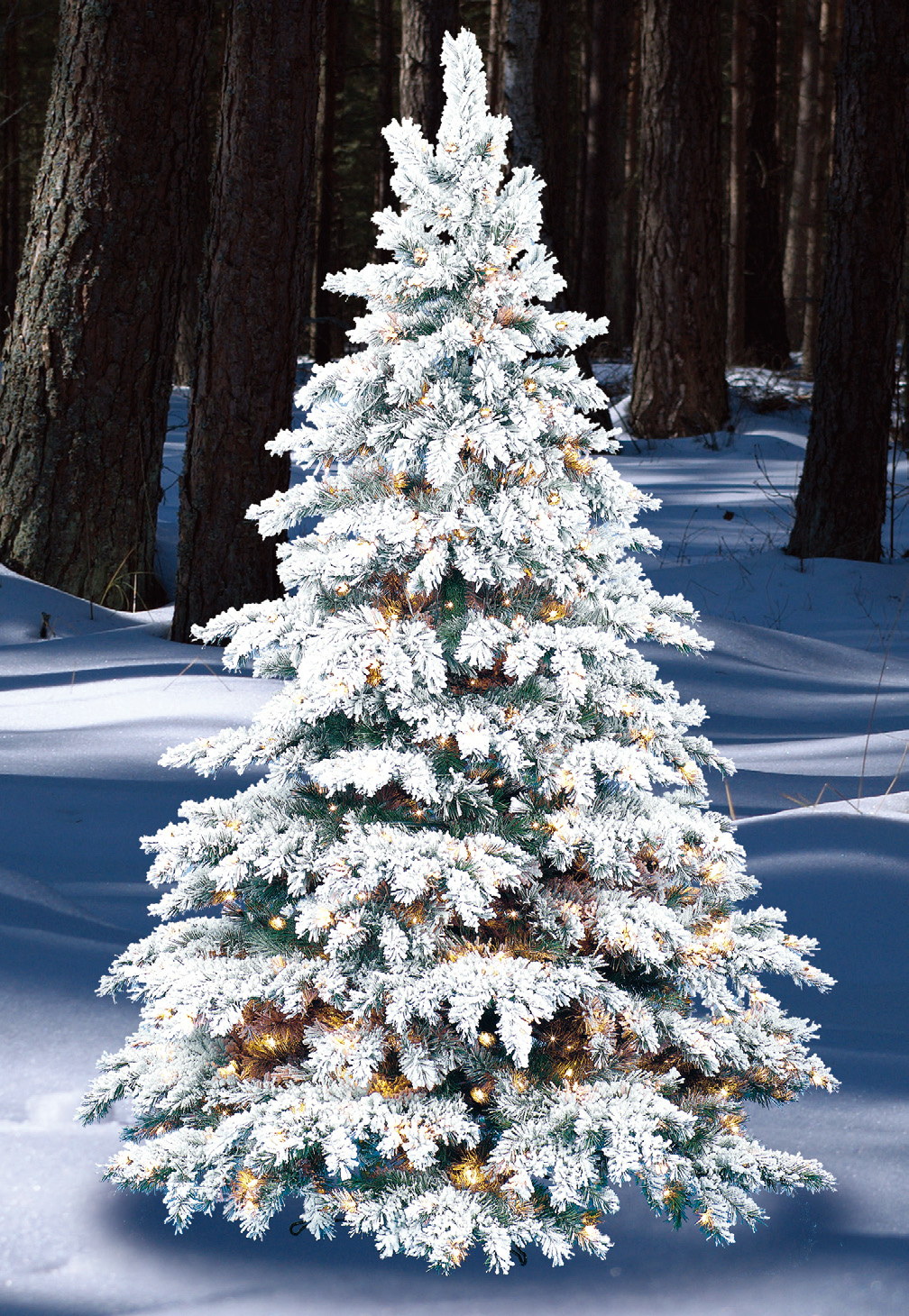 The famous Flocked Silvertip Winter Wonderland Christmas tree is perfect for countless outdoor applications and uses because of the white flocked woven “snow inch effect, laced into the 1,630 individual “needle inch tips of the tree. This deluxe Christmas tree is further enhanced by 800 individual clear incandescent lightbulbs. The tree is 9ft tall.