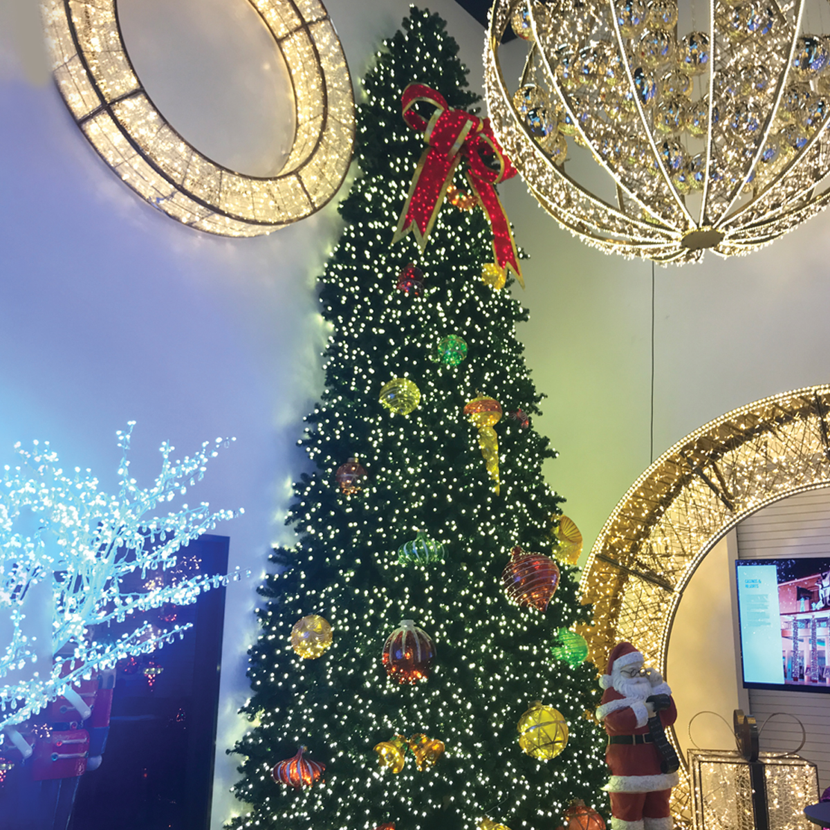 This Christmas tree is commanding and impressive, ideal for great rooms, food courts, strip malls, shopping centers, and large, open-to-the-roof two-story indoor applications. The tree features thousands of individual lightbulbs, multi-colored with red, green, and blue colors. The tree is 16ft tall.