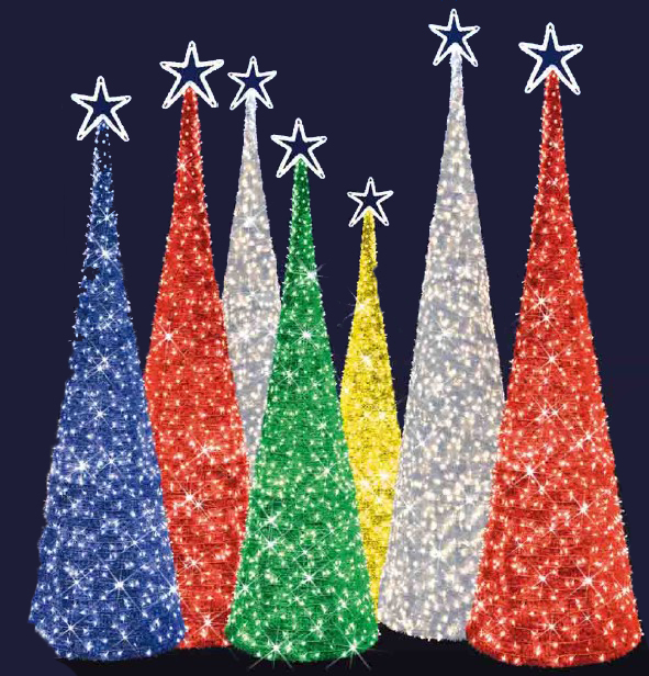 Perfect for outdoor commercial Christmas decor, this 12ft 6in tall yellow cone tree with a star on top is three-dimensional and illuminated by pure white static LED mini bulbs with a cool white 10% flash. 24 volts, 37 watts, includes a power supply. Ideal for outdoor commercial applications but could be installed in high-ceilinged indoor space.