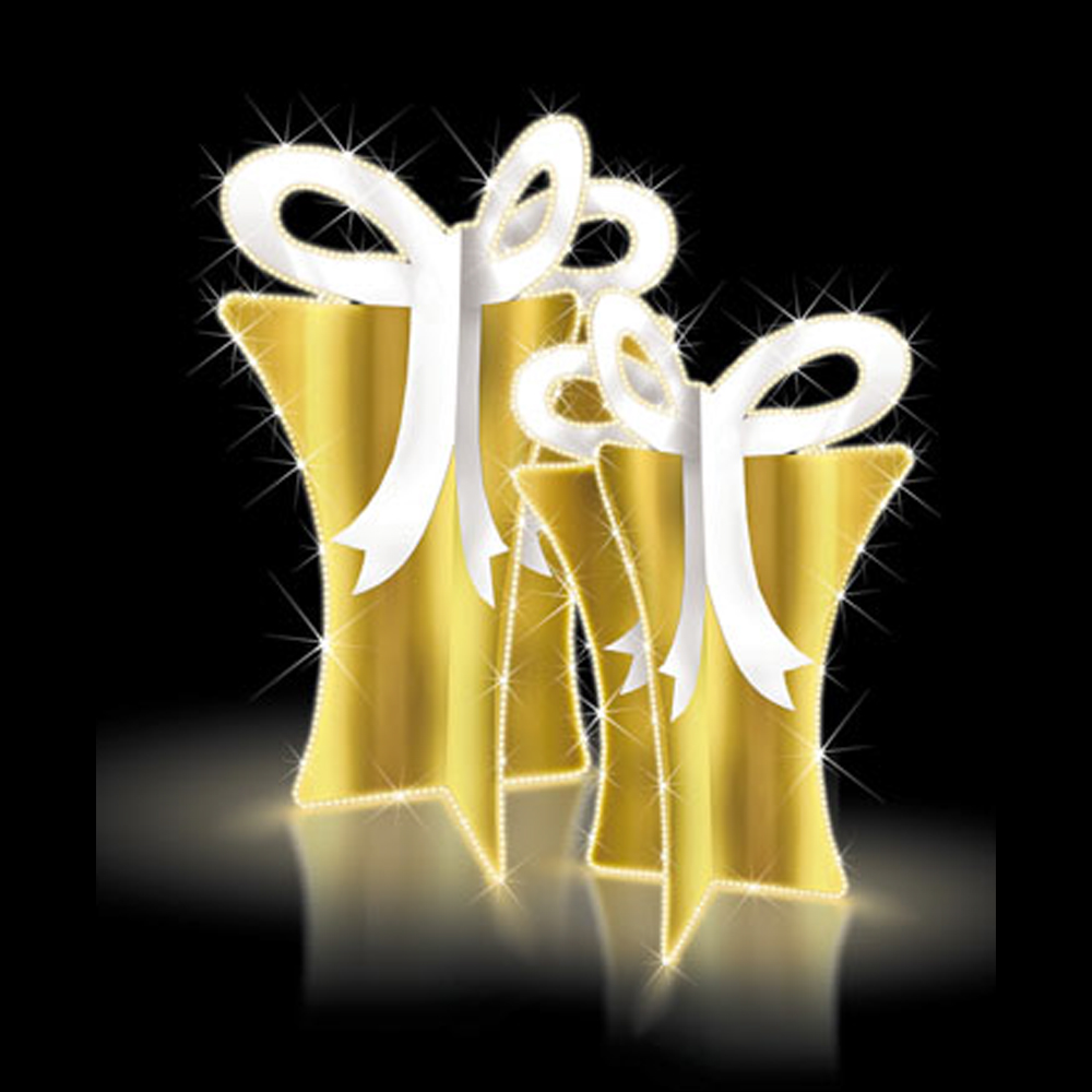 Two 3D folding Christmas presents. Bright and colorful in golds and silvers, the assembled boxes measure 3.9' tall, 2.6' long, and 2.6' wide. Power is 14 watts, 24 volts. Bright lights & a heartwarming illuminated Christmas display. Power supply included.