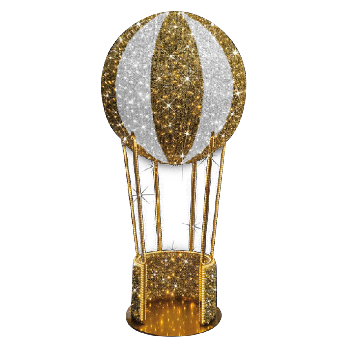 Beautiful gold 3D hot air balloon, 14ft 8 inches tall, brilliantly lit by hundreds of high-tech mini-LEDs, perfect for a luminous and eye-catching Christmas display. Also makes for a great photo op for customers and visitors. 149 watts, 24 volts, comes with a power supply.