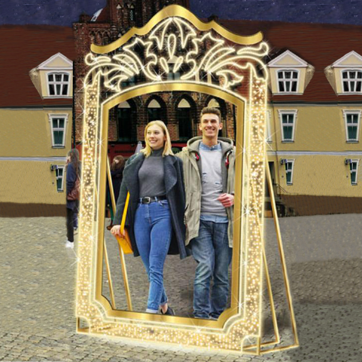 Gold crenelations and an opening in the center perfectly sized for two people, this 2D photo op frame is 8.9' tall and 5.2' wide. Comes with a power supply. Ideal for positioning just inside or near an entrance to a retail store, shopping mall, or event venue. Help customers make timeless memories with a commercial Christmas decor photo op display! 62 watts, 24 volts.