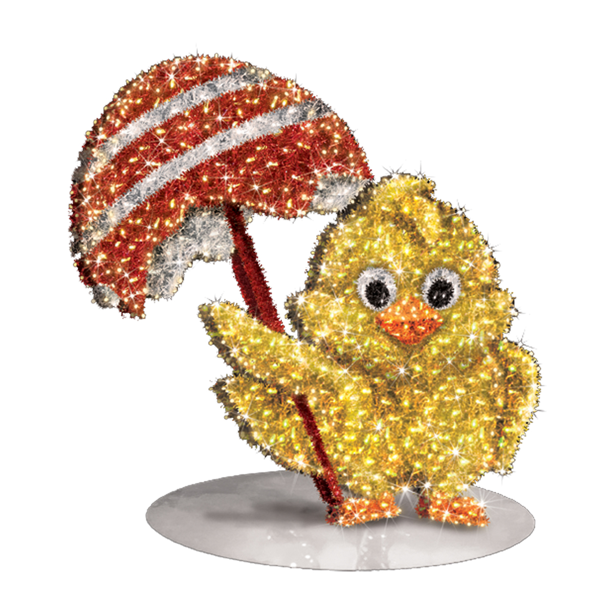 This two-dimensional large illuminated Easter display is the perfect decoration for Easter Sunday; this two-dimensional large illuminated Easter display measures 6.6' tall and 6.5' wide. Warm white static LED mini bulbs, gold, red, silver, and orange carpet for outdoor use, black plexiglass for the eyes. 24 volts with included UL power supply and U.S. plug adaptor.