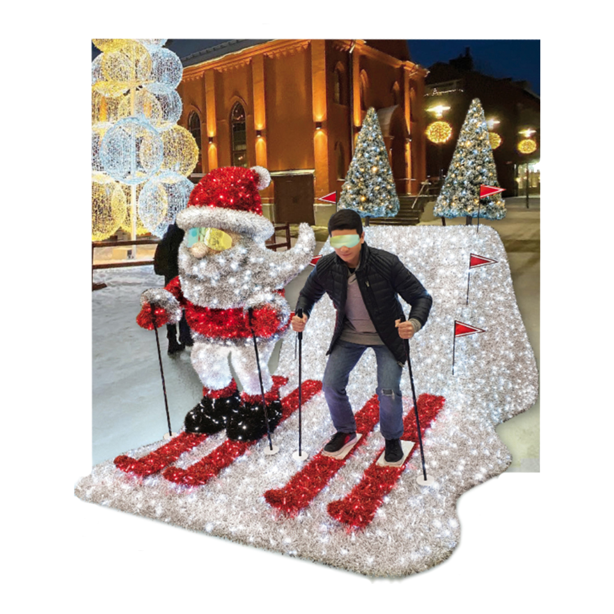 This large Christmas display is sure to draw customers and visitors in and help them get into the Christmas spirit! The ski slope photo op features a life-size Santa on skis, next to an empty spot for the photo subject to stand. Perfect for customers to make cherished Christmas memories. The display is 11.2' tall, 14.4' wide, and 9.2' deep. 210 watts, 24 volts, includes a power supply.