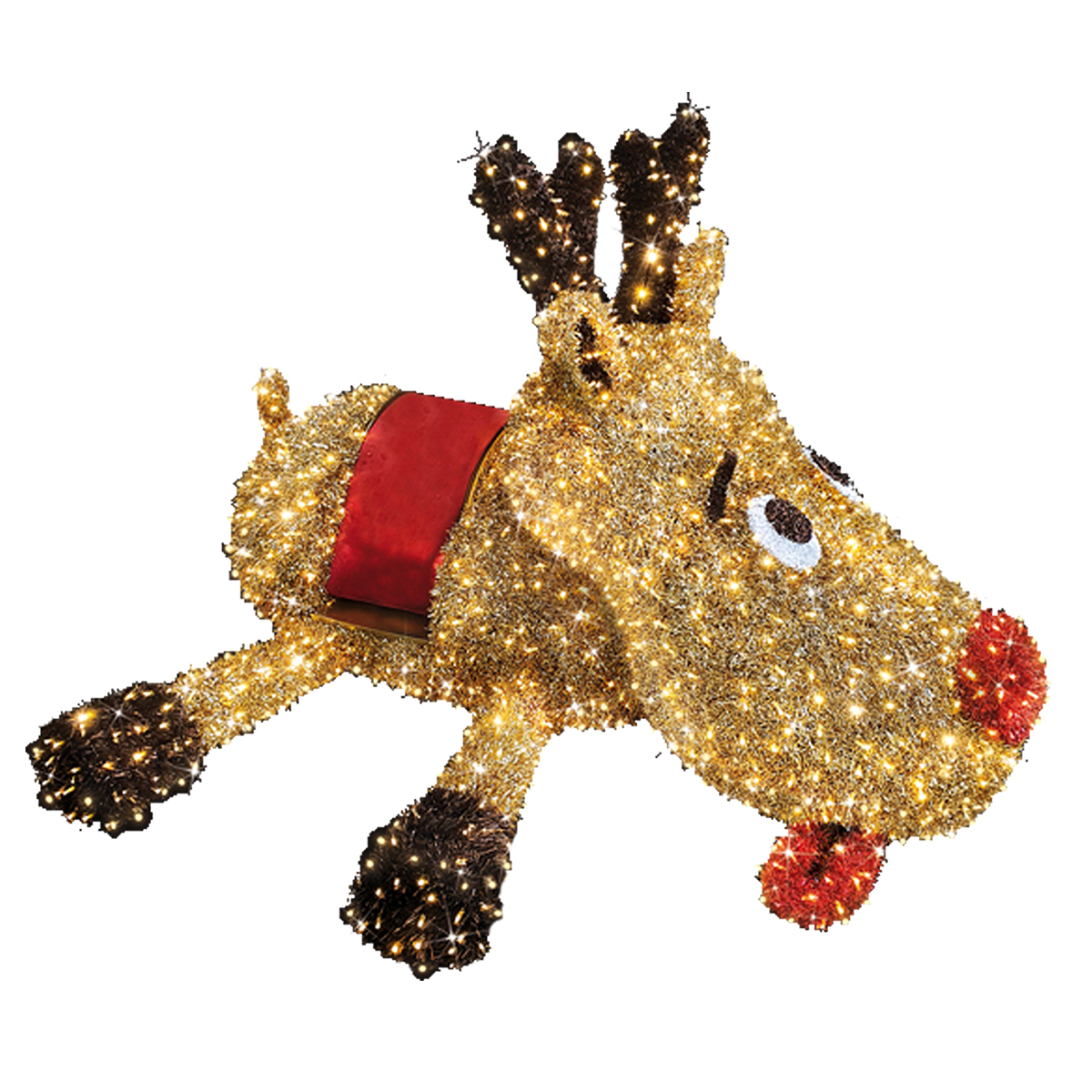 More than life-size, larger than life, Run Down Rudy is a humorous, sparkling, luminous large Christmas display. Measurements are 6.2' tall, 9.3' long, 8.9' wide. 100 watts, 24 volts, includes a power supply.