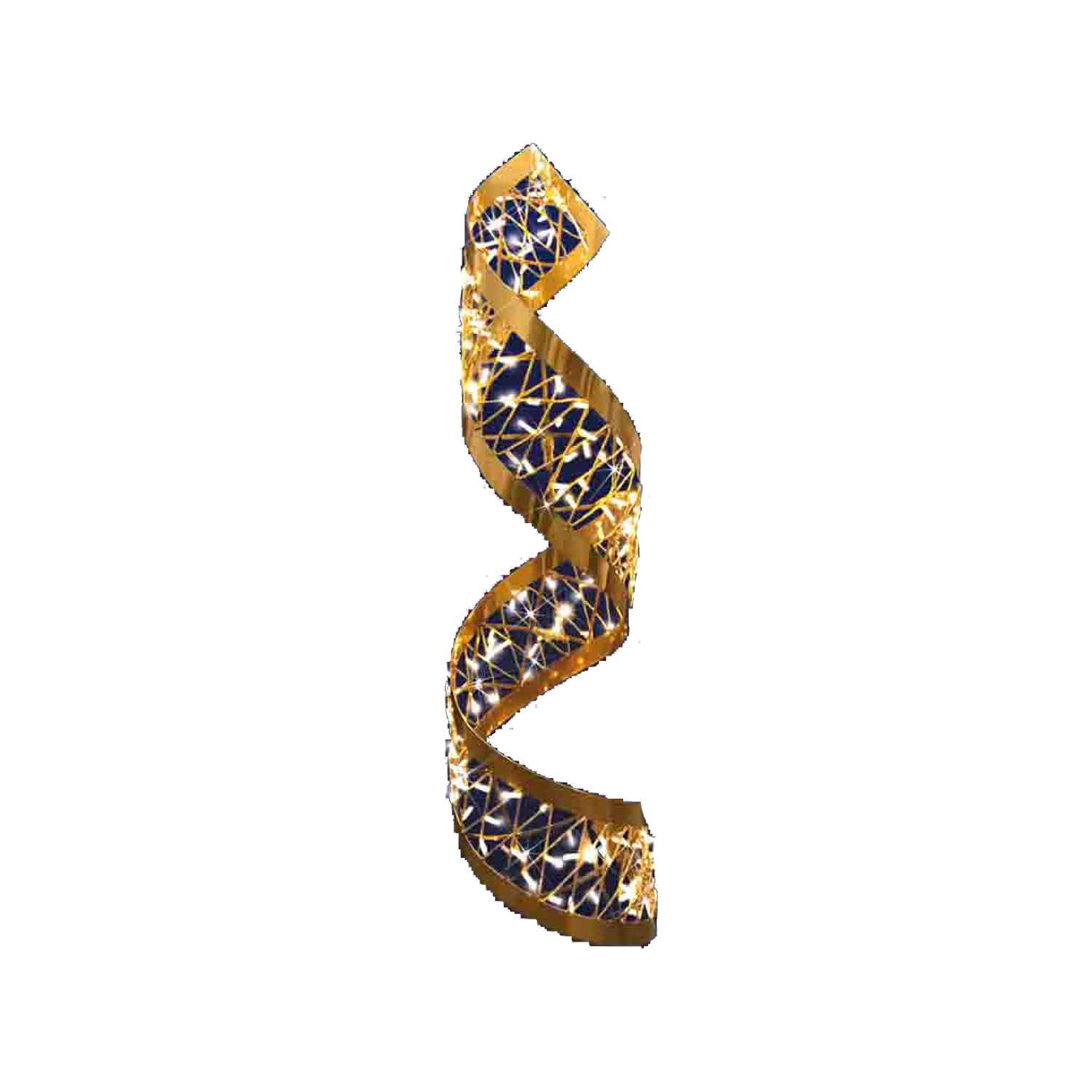 Simple and yet iconic, this Christmas decoration has touched the hearts of children and adults for generations. The simple 3D swirl is meant to be suspended from above, and the slightest breeze funnels wind through the swirl, causing it to swirl and twirl seemingly of its own accord. This swirl is 4ft 4in long, 1ft 1in wide. It is lit by LED lights for an extra-beautiful effect at night. 12 watts, 110 volts. Gold in color.