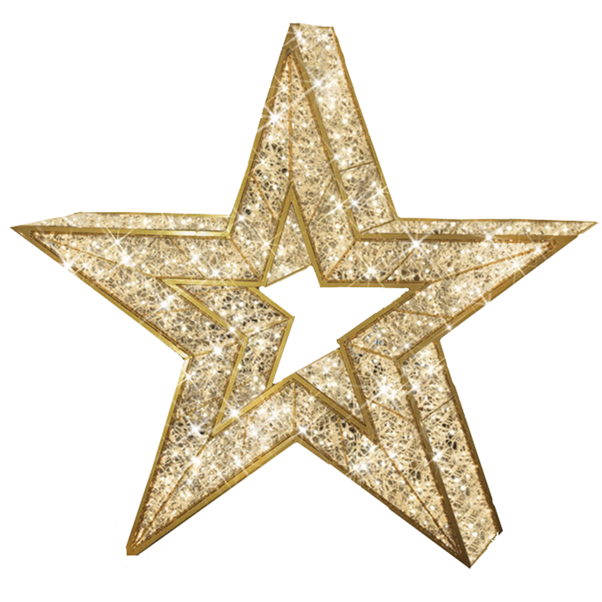 Bright with cool white LED light, this stunning gold star is made from a sturdy yet lightweight aluminum frame, powder coated in gold, filled in with transparent PVC net, and entwined with 1,680 individual LED bulbs emitting warm white light. Power supply is included, 24 volts with a 10% LED flash.