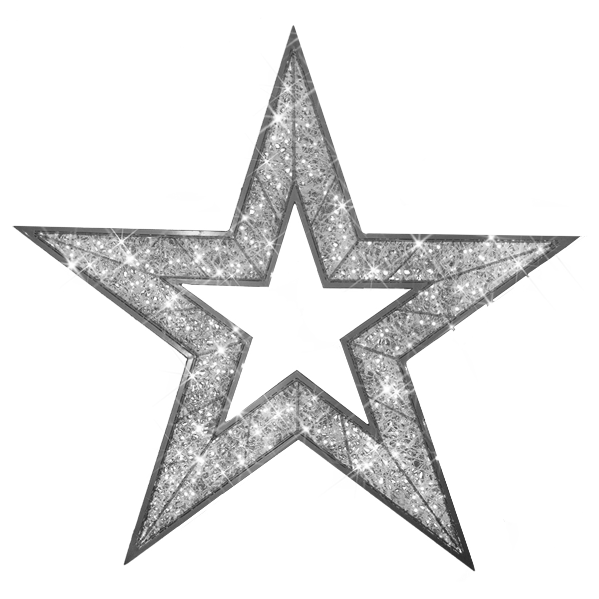 Few things are more iconic and representative of Christmas than a star decoration. This star is two-dimensional, silver in color, and measures 6ft in diameter. The star is built from transparent yet sturdy PVC construction, powder coated in silver paint. Static LED lights with 10% flash, power supply included. 24 volts.