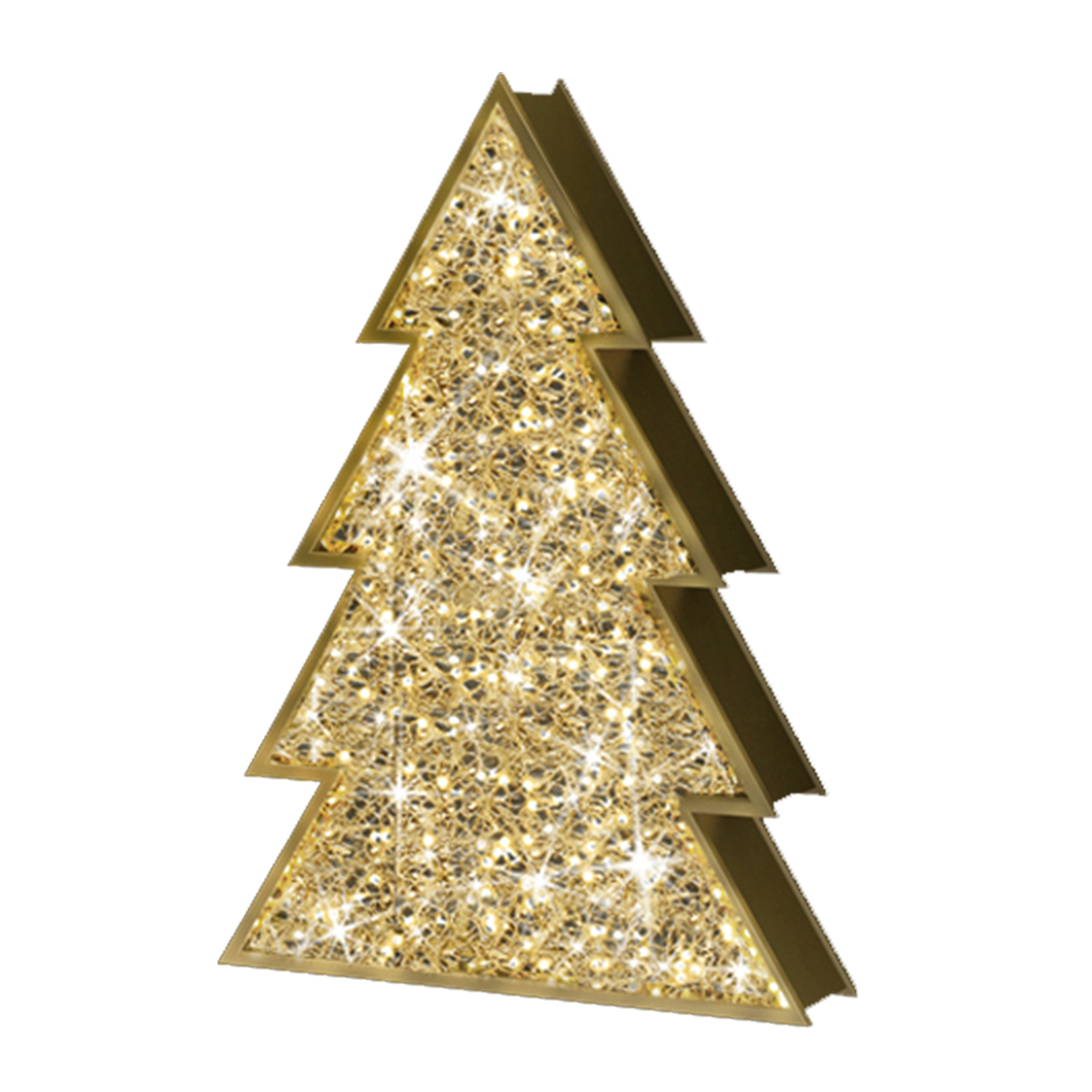 Beautiful two-dimensional Christmas display with approximately 1,760 individual LED bulbs, mostly static lights but with 10% of bulbs on a flash setting. Measures 118 inch tall and 76.7 inch wide. Aluminum construction, painted, decorated with transparent PVC net. Power supply included in package. 24 volts. Gold in color.