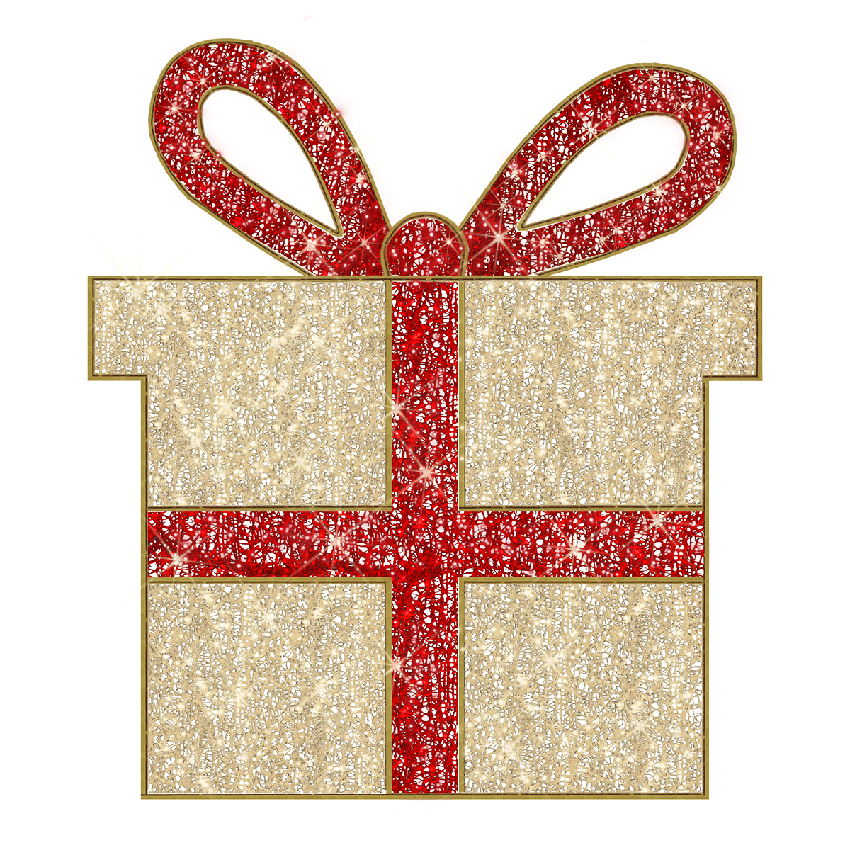 A two dimensional Christmas display, this red and gold gift box utilizes an array of white and red LED lights to brighten the display. 6ft tall and 4.6ft wide. Powder coated and built with a transparent and red double plastic net and frame, this beautiful Christmas display is durable and built to last many seasons to come. Approximately 280 LED lights. 24 volts, 14 watts.