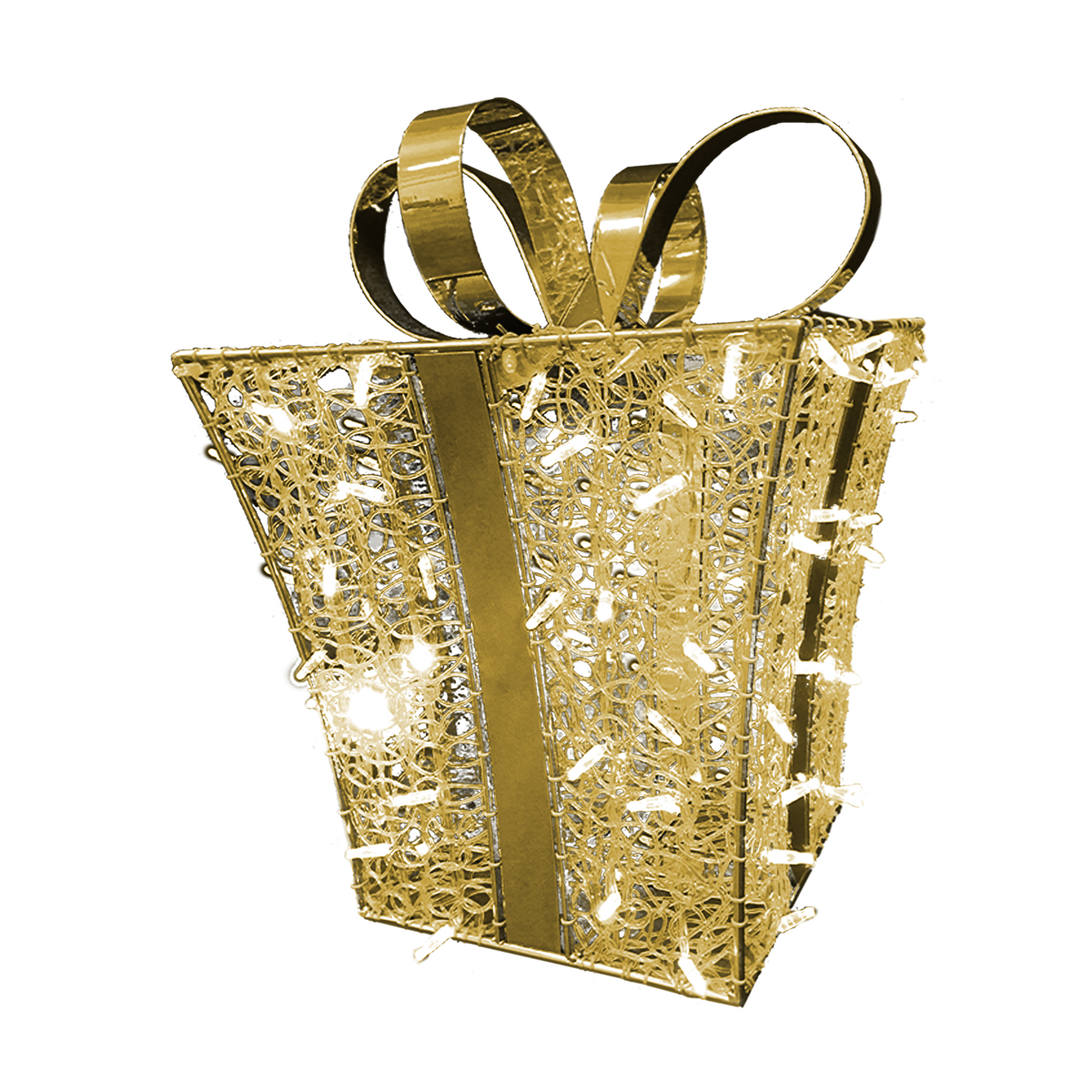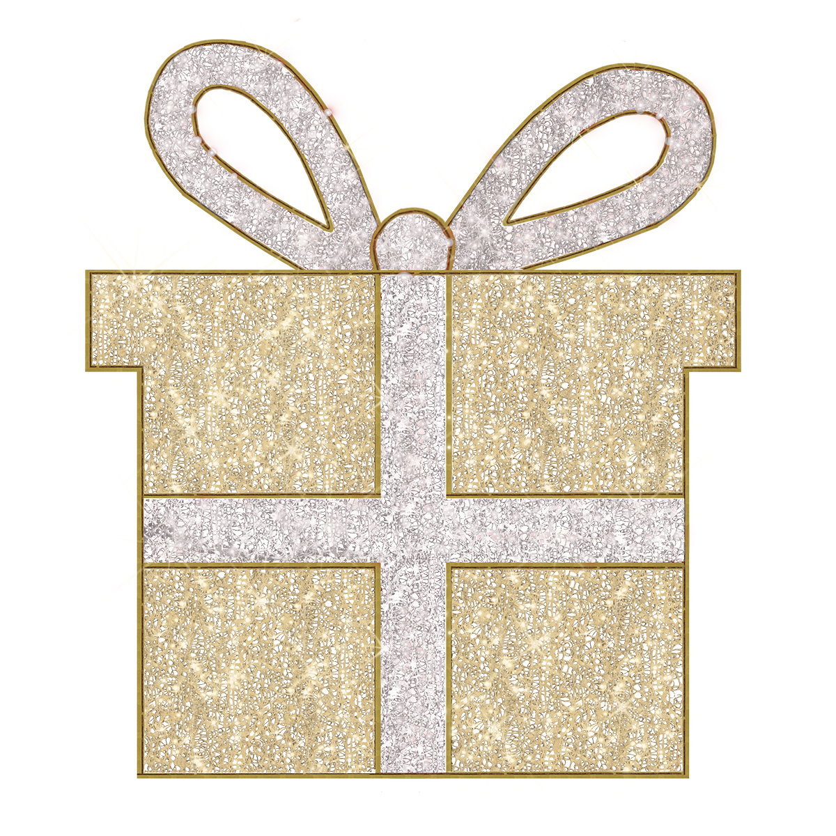 Luminous, warm, welcoming, and eye-catching with hundreds of individual LED lights that match the gold tone of the powder coating, this cylindrical gift box Christmas display is 2.2ft tall, 1.6ft wide, and 1.6ft long. 8 Watts, 24 volts. Ideal for hotel lobbies, shopping centers, event centers, venues, parks, city squares, courtyards, etc.