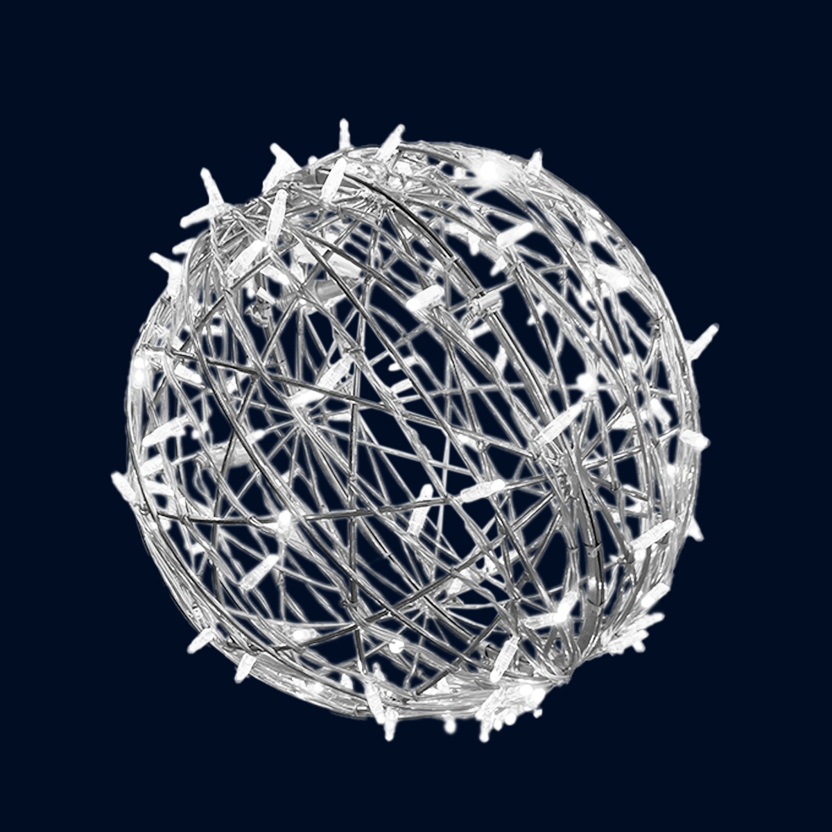 A best-seller, both eye-catching and awe-inspiring, this white powder coated Christmas decor wireframe knitted ball is luminous and shines bright with approximately 320 high-tech LED warm white lights. The Christmas display measures 27-28 inches in diameter. This holiday display is best-suited for shopping malls, big box stores, hotels, event centers, venues, and full-size commercial Christmas displays. (10% flash, 24 volt, includes power supply).
