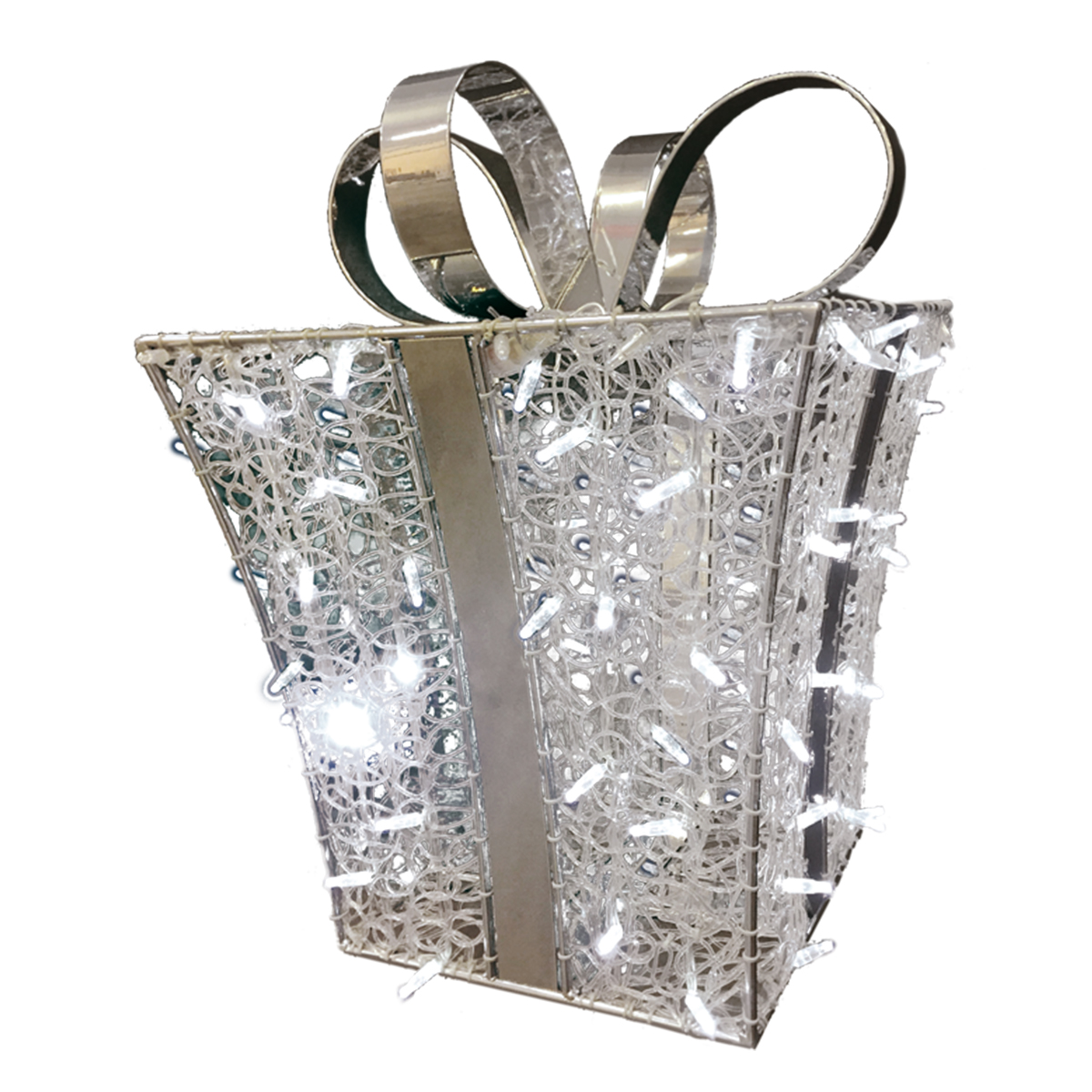Luminous and eye-catching with hundreds of individual sharp white LED lights that match the silver tone of the powder coating frame, this angled gift box Christmas display measures in at 2.1ft tall, 1.6ft wide, and 1.6ft long. 8 Watts, 24 volts. Ideal for resort lobbies, indoor shopping centers, event centers, venues, outdoor parks, city squares, courtyards, etc.