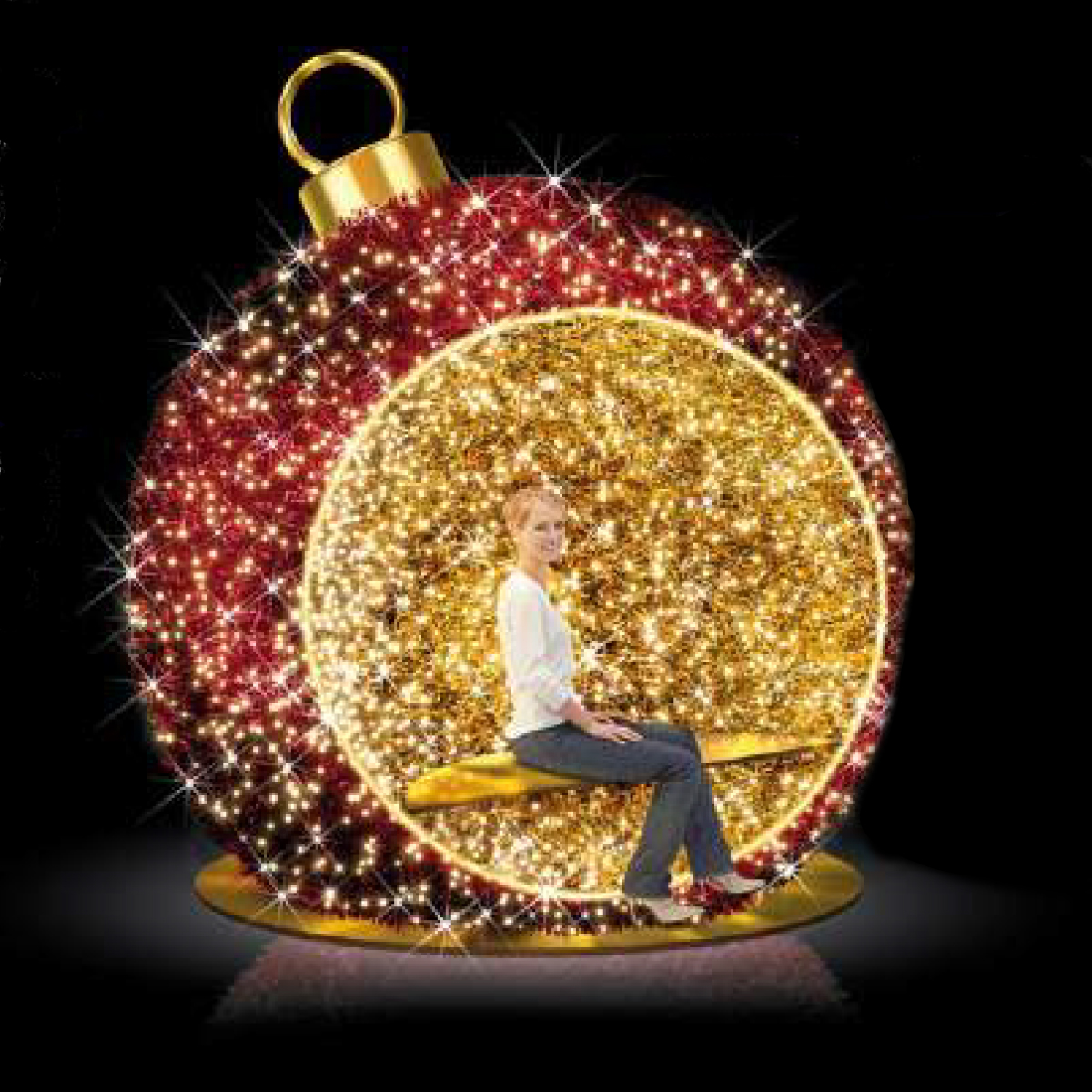 This Christmas photo op display is truly lifelike and mesmerizing. The display has a sitting bench at the center of the ornament, perfect for staging a Christmas photo. The display is 7.5ft wide, 3.7ft deep, and stands at exactly 8.5ft tall. The display is 129 watts and comes with its own power supply. Brilliantly colored in hundreds of individual LED bulbs. LEDs run on a warm white setting with 10% flash.