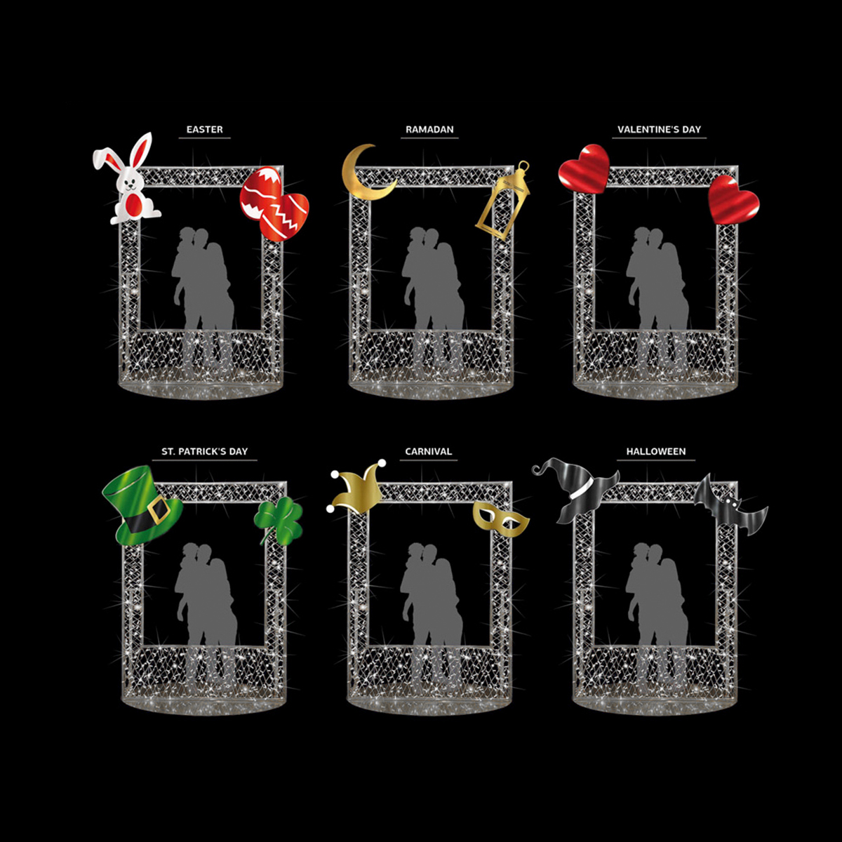 This beautiful holiday photo op frame includes assorted decorations to decorate the frame for all six major holidays, including Easter, Christmas, New Years, and Valentine's Day! The frame measures 8.5ft tall and 6.6ft wide. The display comes with its own 24 volt power supply. Perfect for commercial properties, shopping malls, city parks, big box stores, special events, venues, courtyards, and more, this display is an excellent way to attract new business and bring customers in for a free photo-op.